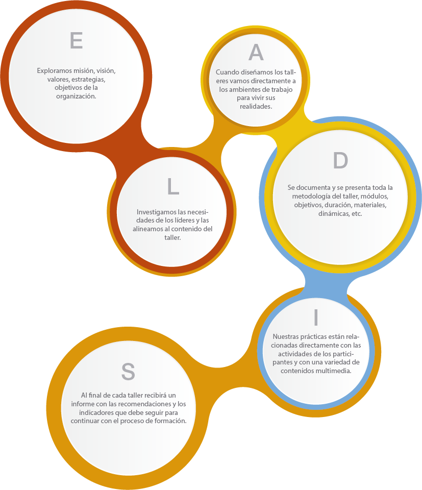 Trabajamos con un modelo de formación que incluye la alineación de los planes estratégicos de la organización y la simulación de ambientes reales de trabajo, con el fin de generar dinámicas efectivas para los procesos de aprendizaje.